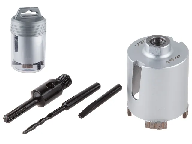 Сухое сверление, полный комплект: Коронка, SDS-plus переходник, центрирующее сверло, клин.