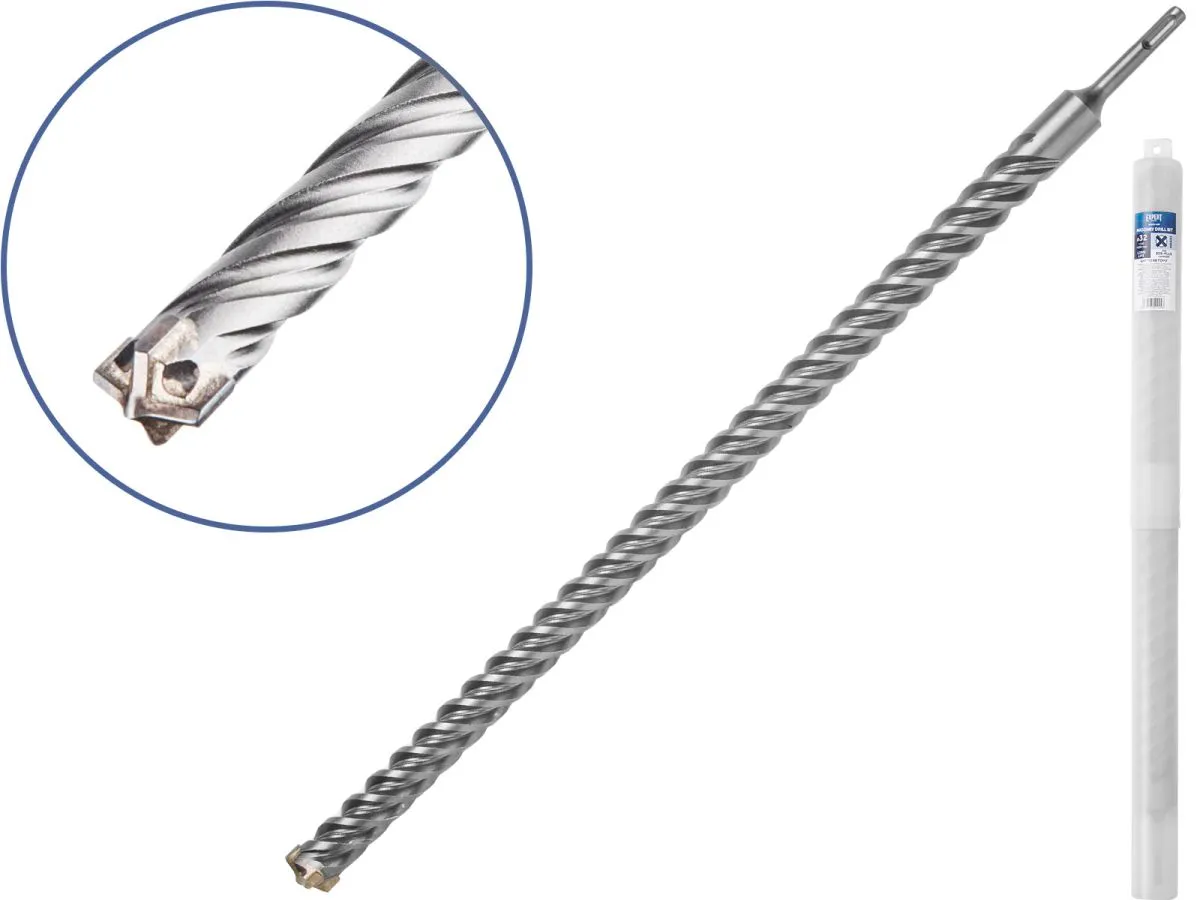 Тип и назначение: бур (сверло) для особо сложных работ при сверлении отверстий в железобетоне, бетоне, кирпичной кладке, камне, граните. Оснащен цельным X-образным твердосплавным наконечником Ceratizit повышенной твердости с четырьмя режущими кромками, который фиксируется особо прочным припоем, рассчитанным на высокие рабочие температуры и значительные ударные нагрузки. Центрирующий наконечник обеспечивает точное засверливание. 4 отдельные канавки быстро и эффективно удаляют шлам и повышают производительность. Тело сверла обладает большей жесткостью, а следовательно меньше подвержено колебаниям в процессе бурения, что улучшает точность просверленного отверстия, снижает износ тела бура и вибрации перфоратора. Подходит для интенсивных нагрузок,