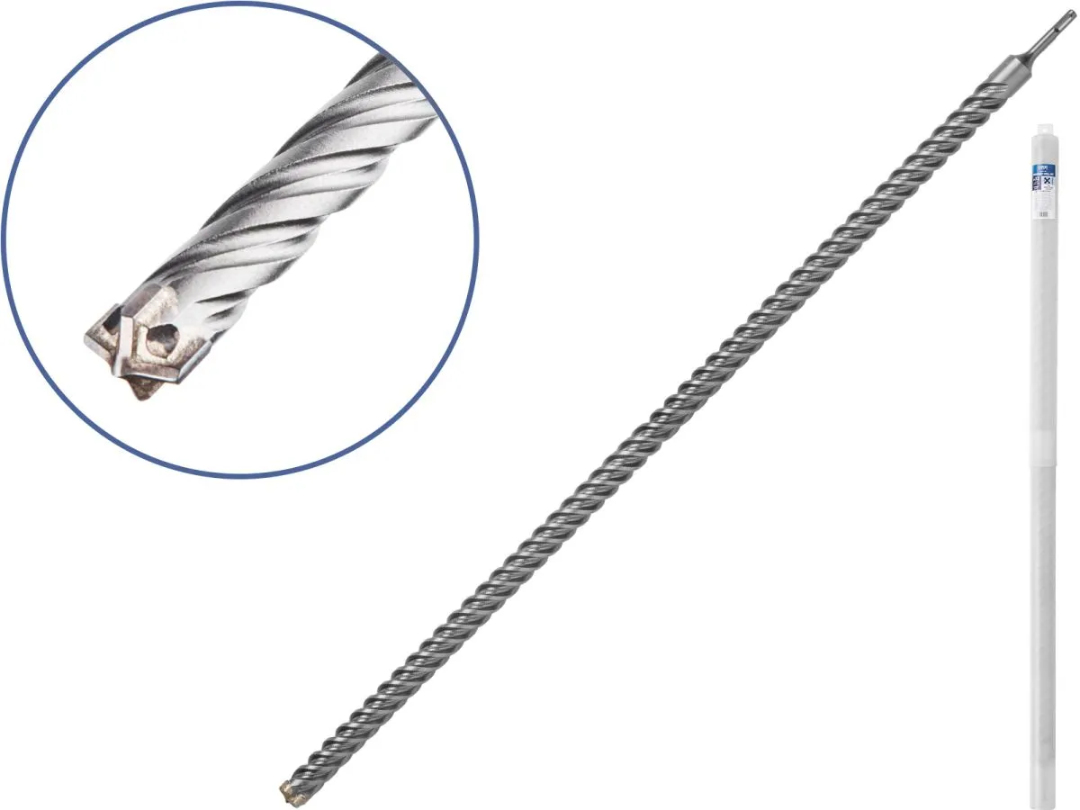 Тип и назначение: бур (сверло) для особо сложных работ при сверлении отверстий в железобетоне, бетоне, кирпичной кладке, камне, граните. Оснащен цельным X-образным твердосплавным наконечником Ceratizit повышенной твердости с четырьмя режущими кромками, который фиксируется особо прочным припоем, рассчитанным на высокие рабочие температуры и значительные ударные нагрузки. Центрирующий наконечник обеспечивает точное засверливание. 4 отдельные канавки быстро и эффективно удаляют шлам и повышают производительность. Тело сверла обладает большей жесткостью, а следовательно меньше подвержено колебаниям в процессе бурения, что улучшает точность просверленного отверстия, снижает износ тела бура и вибрации перфоратора. Подходит для интенсивных нагрузок,