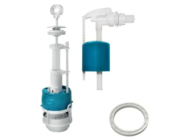 Комплект арматуры для бачка к унитазу. Сливной клапан СБа штоковый (для слива необходимо поднять ручку вверх и отпустить). Система "СТОП ПОТОК" (при нажатии на шток в любой момент смыва вода перестанет сливаться).
