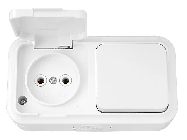 Блок выкл. 1 клав. + розетка (открытая, б/з, брызг. защ.) белая, Пралеска Аква, Bylectrica