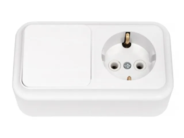 Блок выкл. 1 клав. + розетка (открытая, с/з) белая, Пралеска, BYLECTRICA