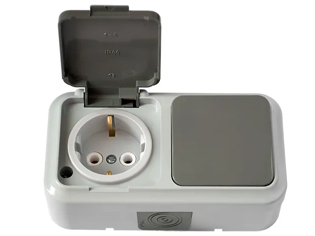 Блок выкл. 1 клав. + розетка (открытая, с/з, брызг. защ.) серая, Пралеска Аква, Bylectrica