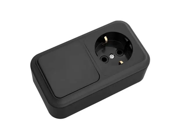Блок выкл. 1 клав. + розетка (открытая, с/з) черный, Пралеска, BYLECTRICA