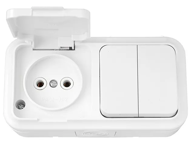 Блок выкл. 2 клав. + розетка (открытая, б/з, брызг. защ.) белая, Пралеска Аква, Bylectrica