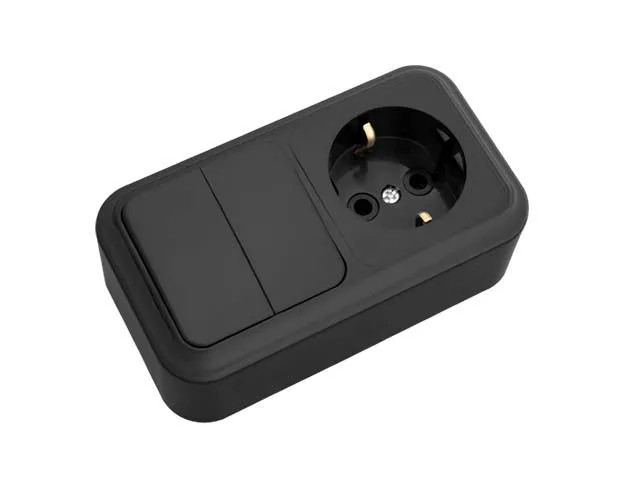 Блок выкл. 2 клав. + розетка (открытая, с/з) черный, Пралеска, BYLECTRICA