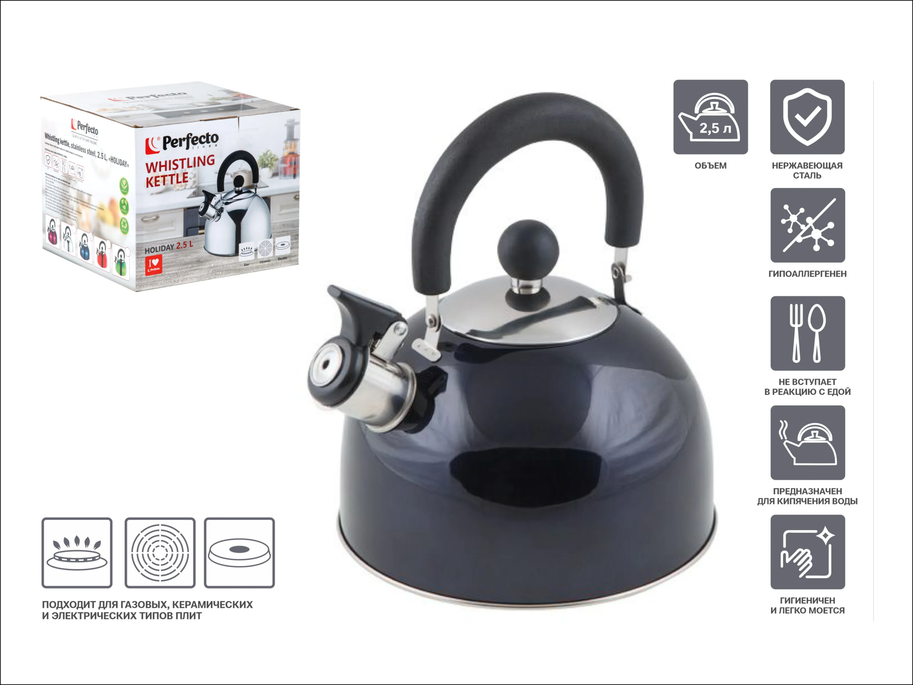 Чайник со свистком, нержавеющая сталь, 2.5 л, серия Holiday, синий металлик, PERFECTO LINEA