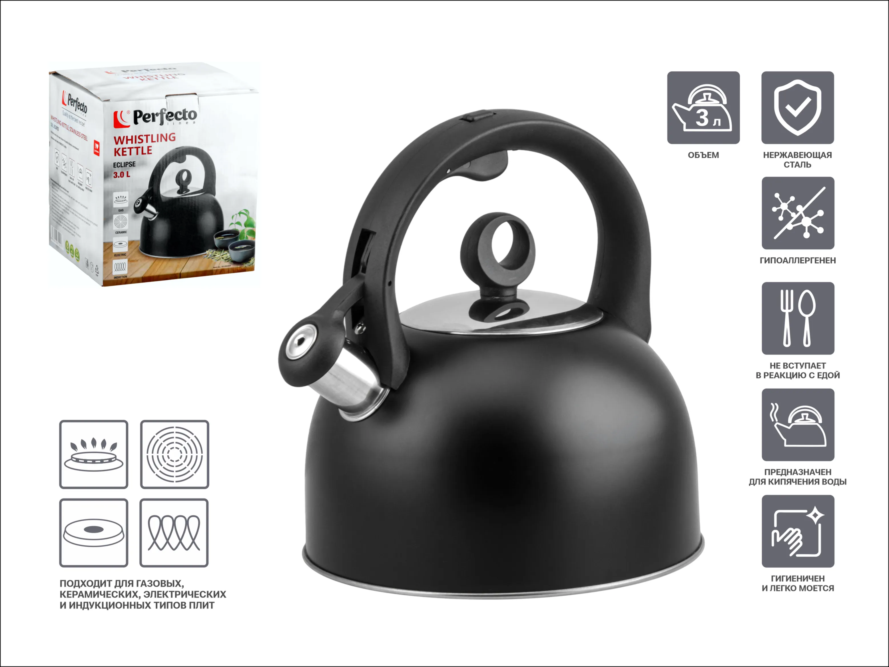 Чайник со свистком, нержавеющая сталь, 3.0 л, Eclipse, PERFECTO LINEA