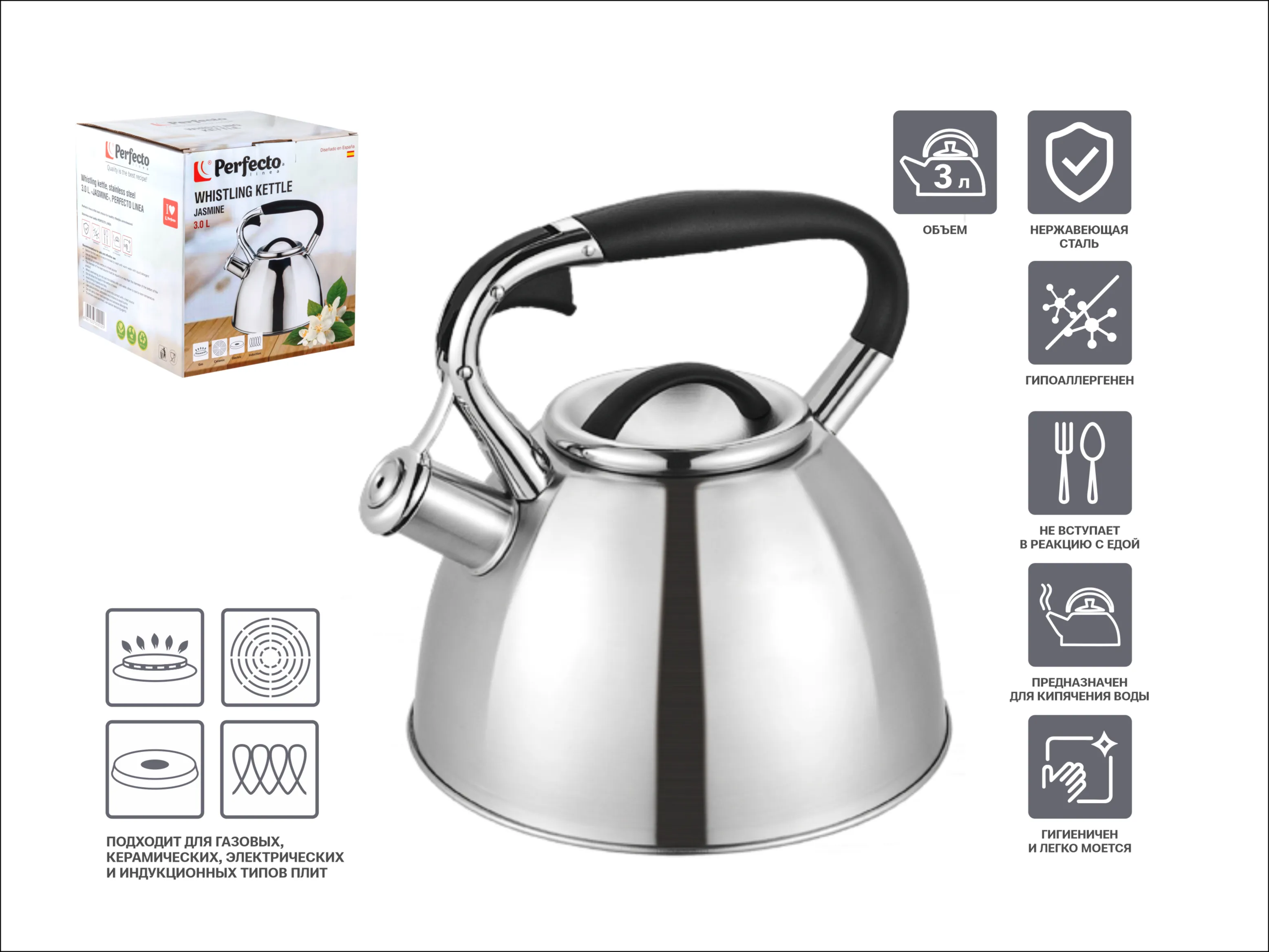 Чайник со свистком, нержавеющая сталь, 3.0 л, Jasmine, PERFECTO LINEA