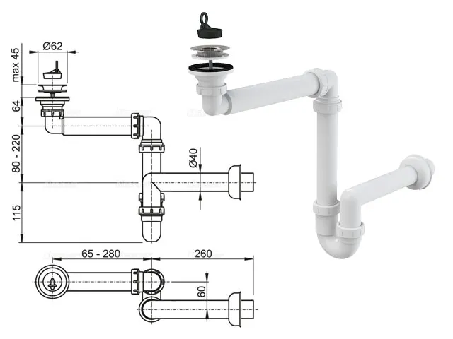 Cифон для умывальника экономящий пространство D63, Alcaplast