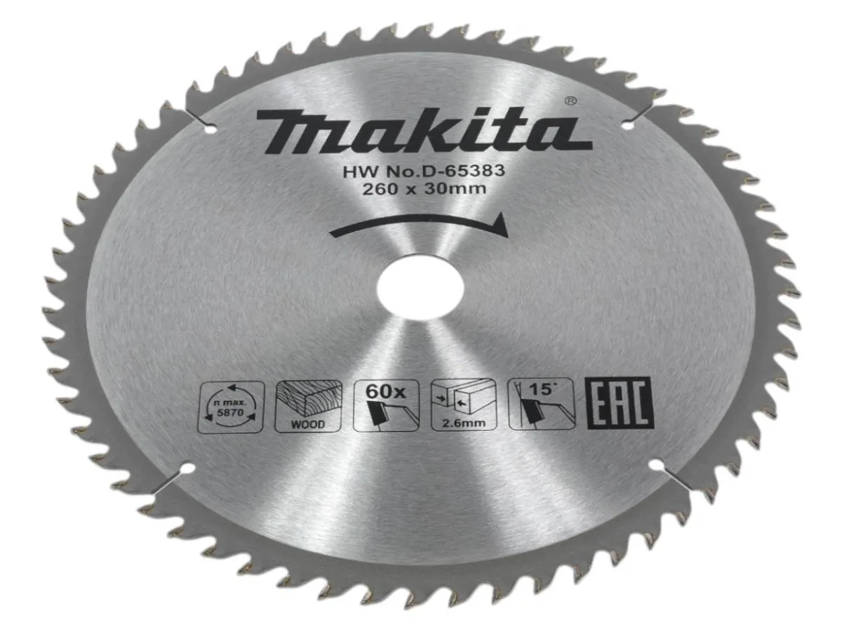 Пильный диск по дереву Makita Standard с твердосплавными напайками. Диаметр 260 мм, посадочное отверстие 30 мм, 60 зубьев. Толщина диска - 1.8 мм.
