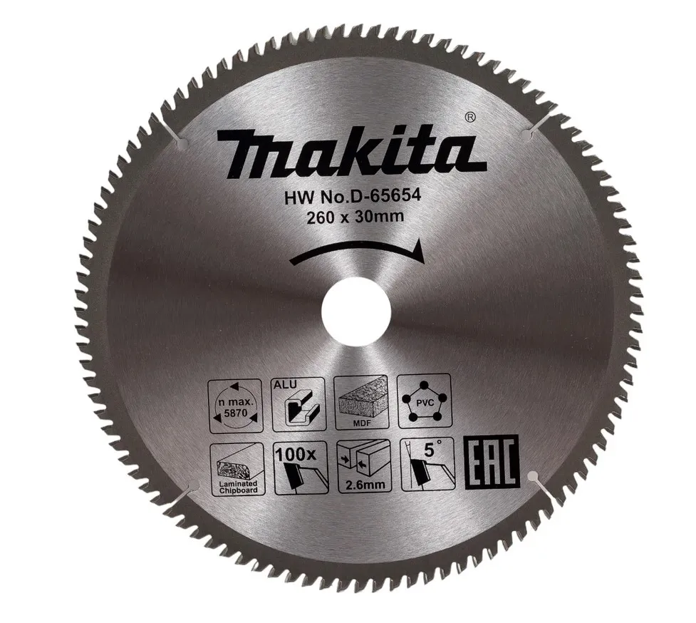 Пильный диск универсальный, STANDART, 260x30x2.6x100T, Makita D-65654. Диск Makita предназначен для резки дерева, алюминия, МДФ, ПВХ, ДСП. Специальная форма зуба (TCG) обеспечивает качественный ровный распил. Благодаря особой форме зубов обеспечивается высокая производительность и надежность работы. Пильные диски выполнены из высококачественных материалов и имеют длительный срок службы. Характеризуется высокой износостойкостью и долговечностью. Оптимальный диаметр диска позволяет использовать его наиболее эффективно. В качестве дополнительного плюса можно отметить тот факт, что диск можно легко установить в инструмент.