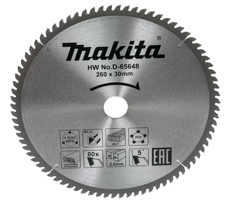 Пильный диск универсальный, STANDART, 260x30x2.6x80T, Makita D-65648. Диск Makita D-65648 предназначен для резки дерева, алюминия, МДФ, ПВХ, ДСП. Специальная форма зуба (TCG) обеспечивает качественный ровный распил. Благодаря особой форме зубов обеспечивается высокая производительность и надежность работы. Пильные диски выполнены из высококачественных материалов и имеют длительный срок службы. Характеризуется высокой износостойкостью и долговечностью. Оптимальный диаметр диска позволяет использовать его наиболее эффективно. В качестве дополнительного плюса можно отметить тот факт, что диск можно легко установить в инструмент.