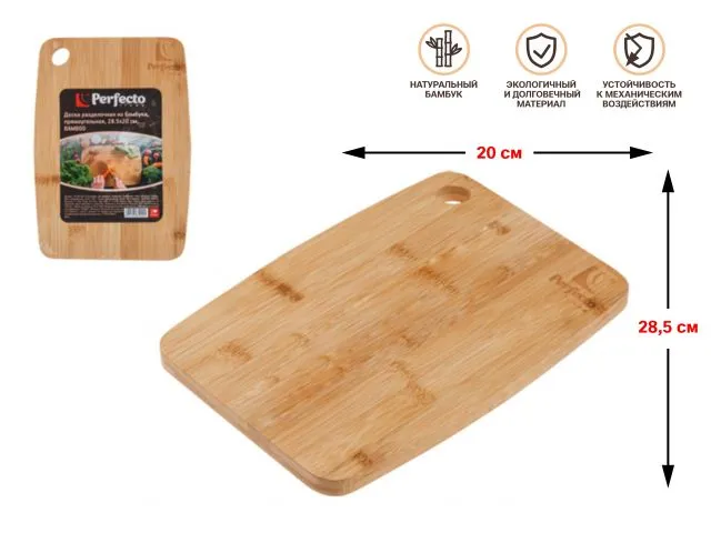 Доска разделочная из бамбука размером 28.5х20 см - это отличный выбор для любителей приготовления пищи. Бамбуковый материал не только красив, но и надежен. Доска обладает гладкой поверхностью и достаточной площадью для нарезки различных продуктов. Благодаря прочной конструкции, доска легко удерживается на месте во время использования, что обеспечивает безопасность при работе с ножом. Эта доска разделочная станет незаменимым помощником на кухне и прослужит вам долгое время.