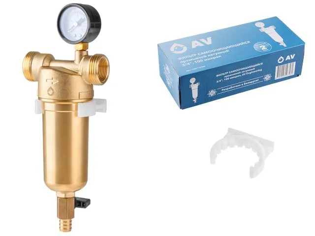 Фильтр самоочищающийся 1" нар. или 3/4"вн., 100 микрон, с манометром, AV Engineering (инд. упак.)