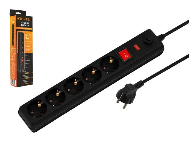 Фильтр сетевой 3м (5 роз., 2,2кВт, с/з, выкл, ПВС 3х0,75) черный Юпитер