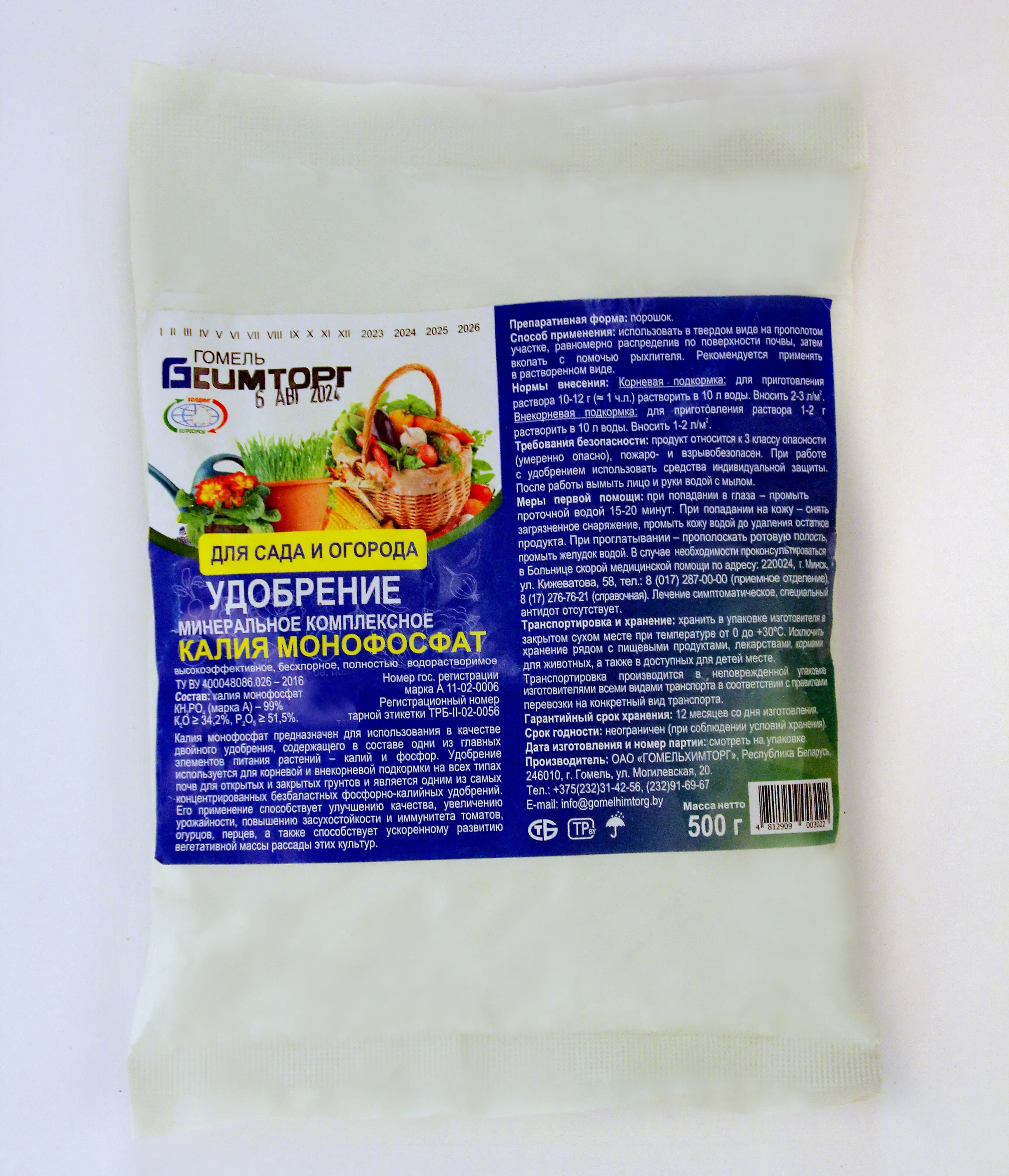 Калия монофосфат – продукт, предназначенный для использования в качестве высокоэффективного бесхлорного двойного удобрения, содержащего в качестве питательных элементов фосфор и калий, сырья для производства пищевых добавок, химических реактивов и др.