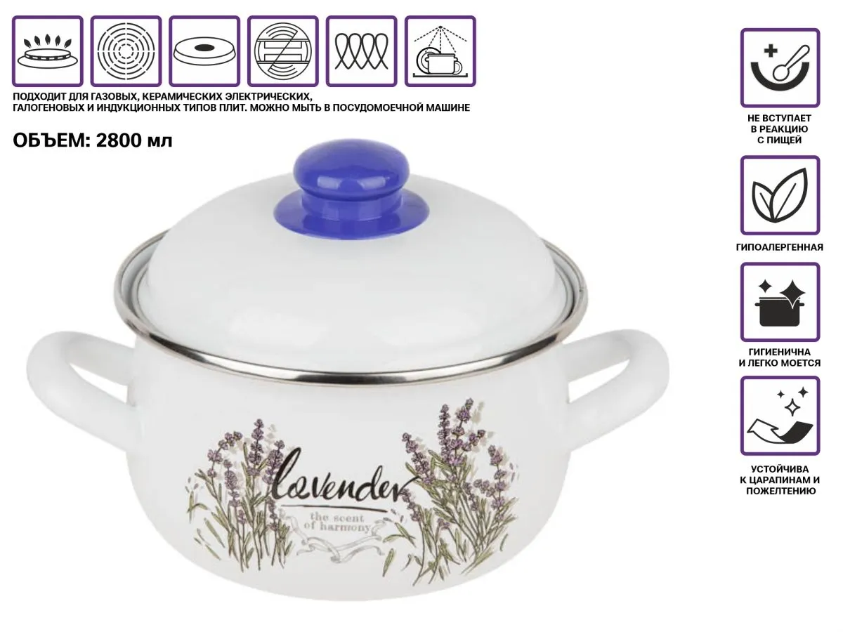 Кастрюля стальная эмалированная, 2.8 л, серия Цветок лаванды, PERFECTO LINEA