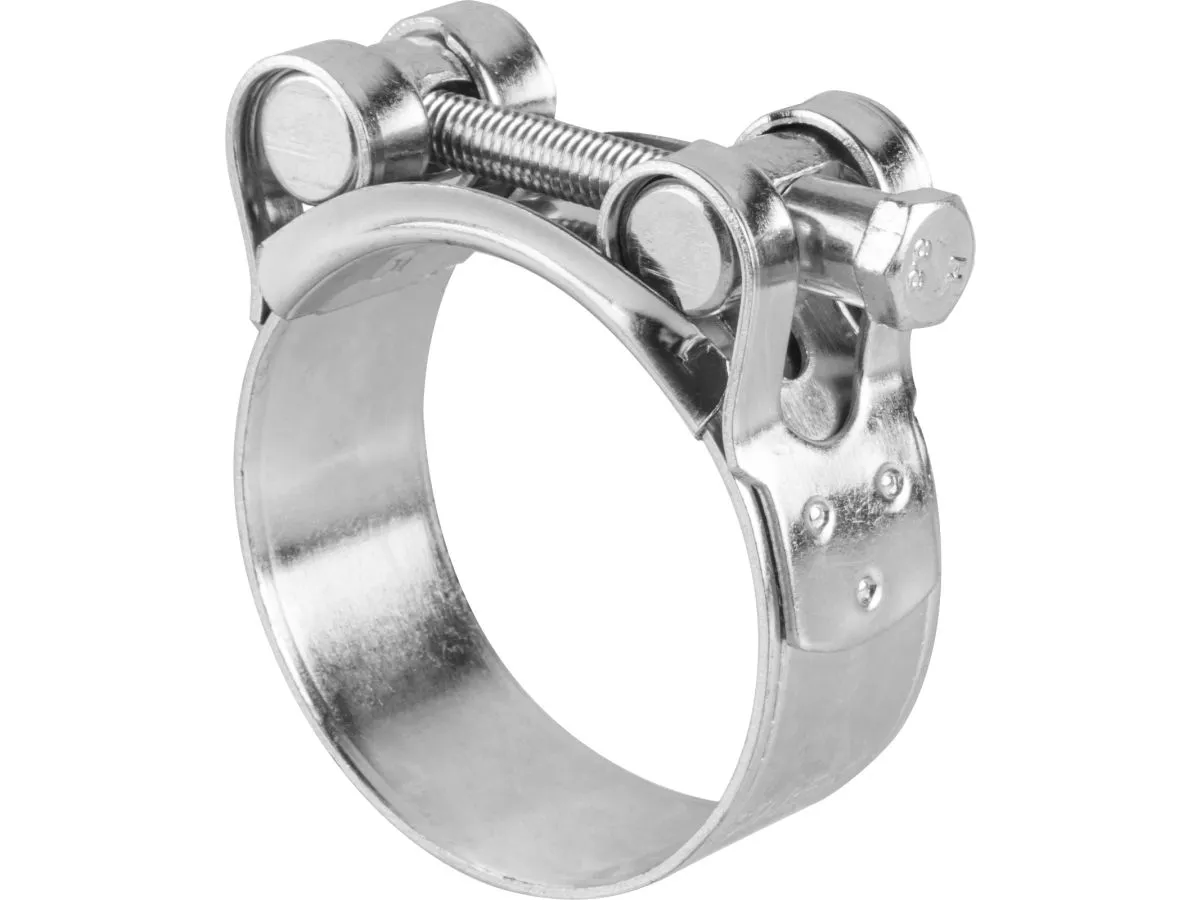 В конструкцию силового хомута входят: прочный болт с несъемной распоркой, шарниры в петлях корпуса, усиленная лента и предохранительный мостик. Края ленты отбортованы, что позволяет защищать руки от травм и предохранять поверхность шланга от механического повреждения. Для крепления петли корпуса шарнира применяются три сварных точки, что значительно повышает жесткость узла. Болт надежно фиксирует все соединительные элементы, гарантируя прочность и долговечность крепежа. Устройство силовых хомутов обеспечивает их многократное использование, при этом самопроизвольное ослабление хомута невозможно.