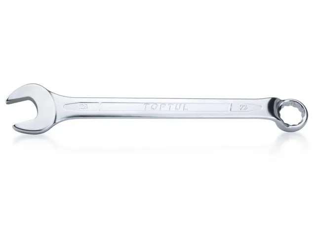 Ключ комбинированный TOPTUL имеет окончание в виде рожкового ключа размером 18мм с одной стороны и окончание в виде накидного ключа размером 18мм с другой стороны. Рожковый ключ имеет смещение 15 по отношению к рукоятке, а накидной - 75. Рекомендуется для профессионального использования.