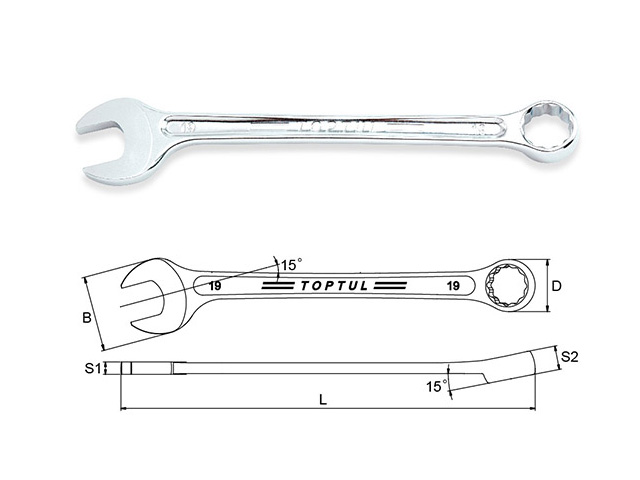 Ключ комбинированный TOPTUL имеет окончание в виде рожкового ключа с одной стороны и окончание в виде накидного ключа с 15 смещением по отношению к рукоятке с другой стороны.