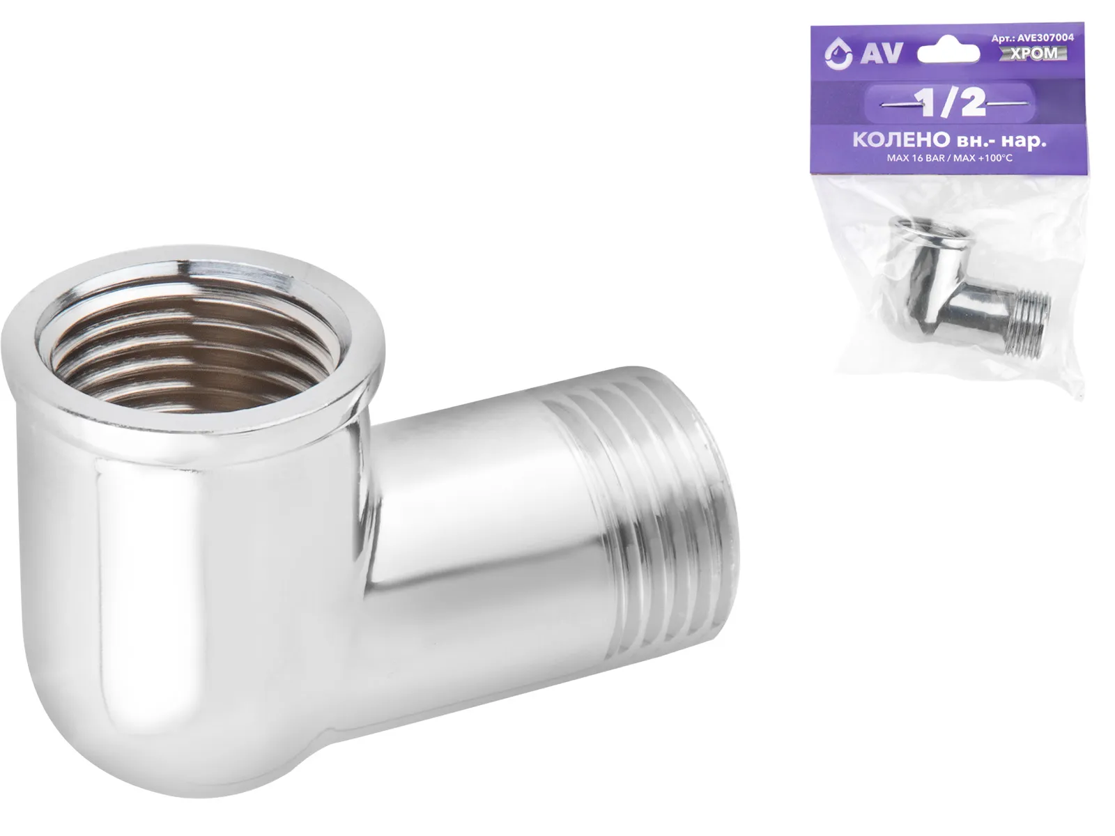 Колено 1/2" вн.-нар. ХРОМ, AV Engineering (инд. упак.)