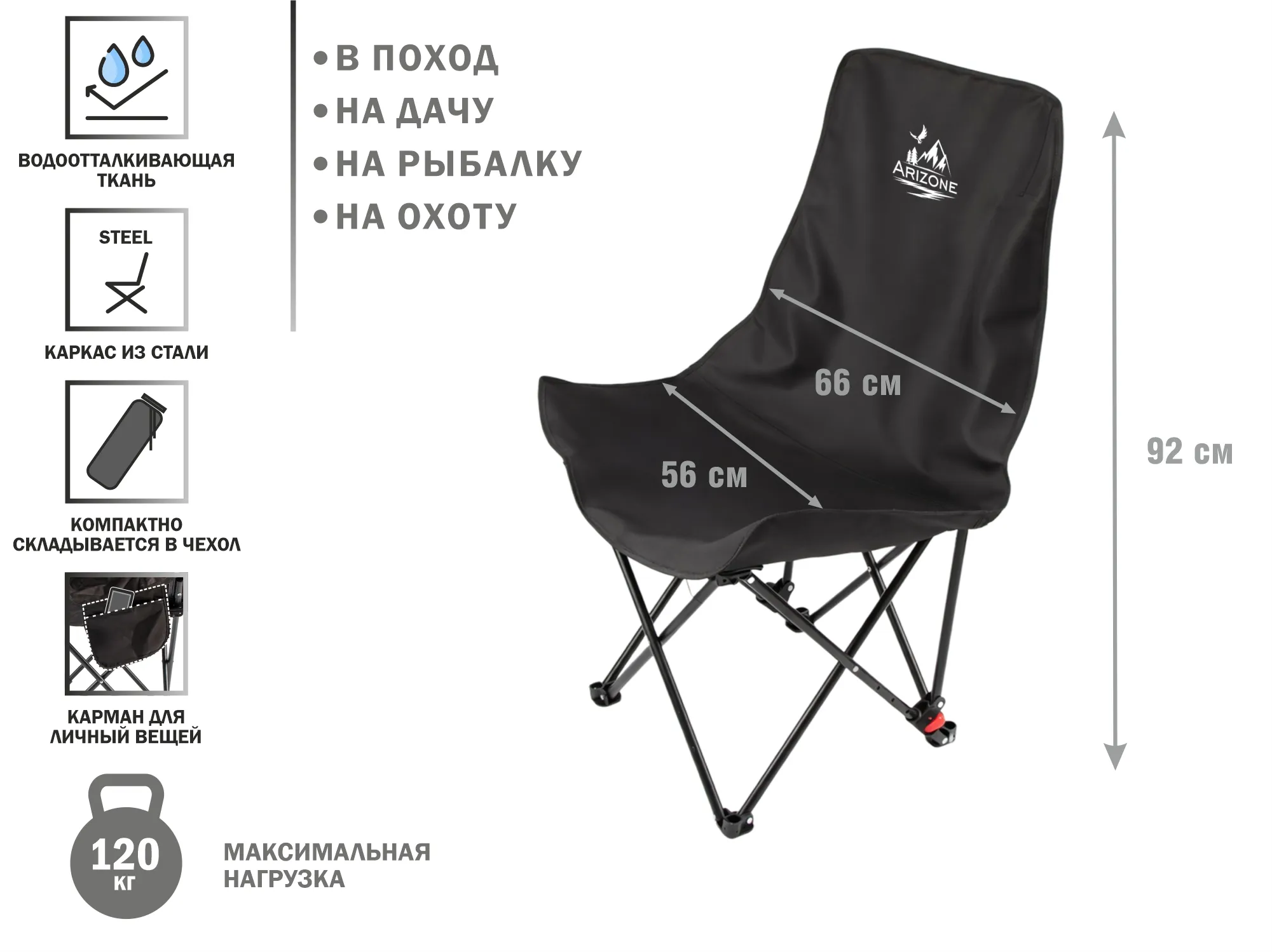 Кресло складное кемпинговое с карманом + чехол, черное, ARIZONE