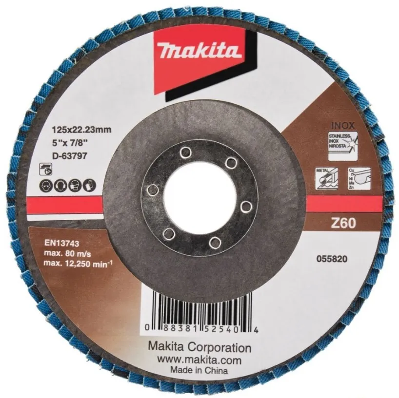 Диск лепестковый шлифовальный 125x22.23 мм, Z60, стекловолокно, угловой Makita D-63797. Благодаря циркониевому корунду, а так же отсутствию оксида железа в составе диск отлично подходит для работ по нержавеющей стали и металлу. Обладает повышенной износостойкостью и отлично справляется со снятием заусенцев, удалением следов побежалости, ржавчины и краски.