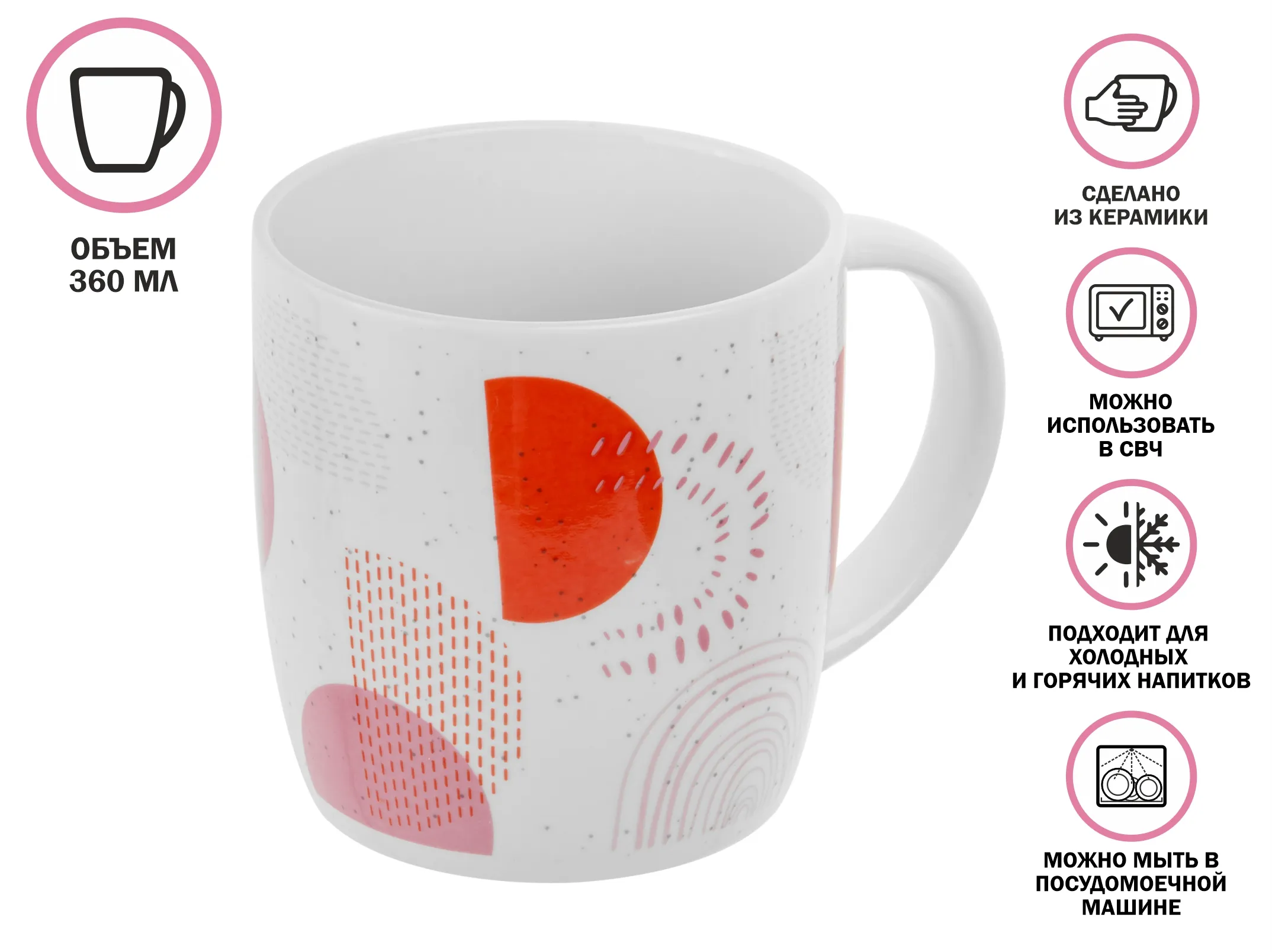 Кружка керамическая подходит для подачи горячих и холодных напитков. Керамика отличается высокой экологичностью. Допускается применение при любой температуре: холодильник, разогрев в микроволновой печи. Неустойчива к перепадам температуры.