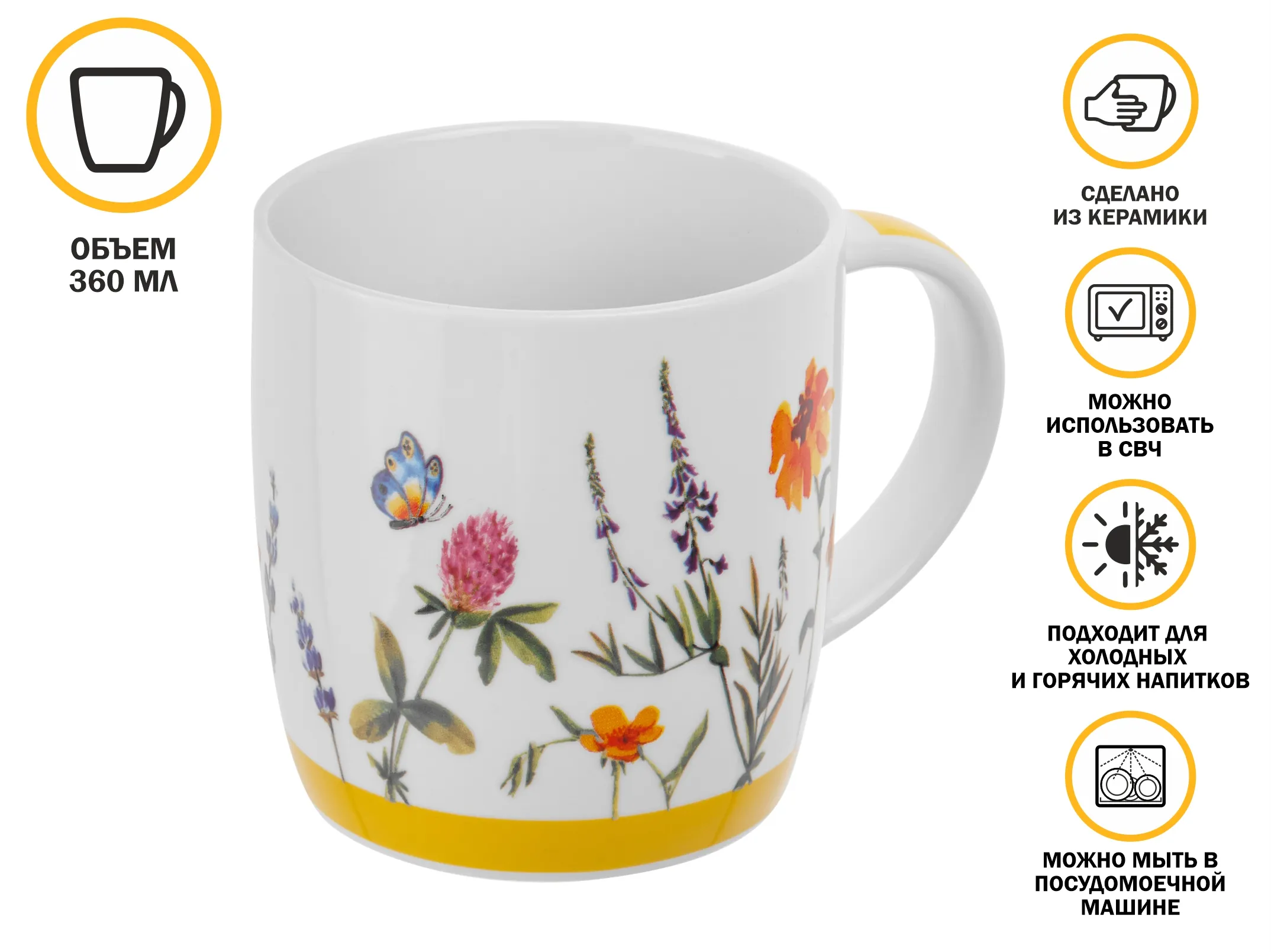 Кружка керамическая подходит для подачи горячих и холодных напитков. Керамика отличается высокой экологичностью. Допускается применение при любой температуре: холодильник, разогрев в микроволновой печи. Неустойчива к перепадам температуры.