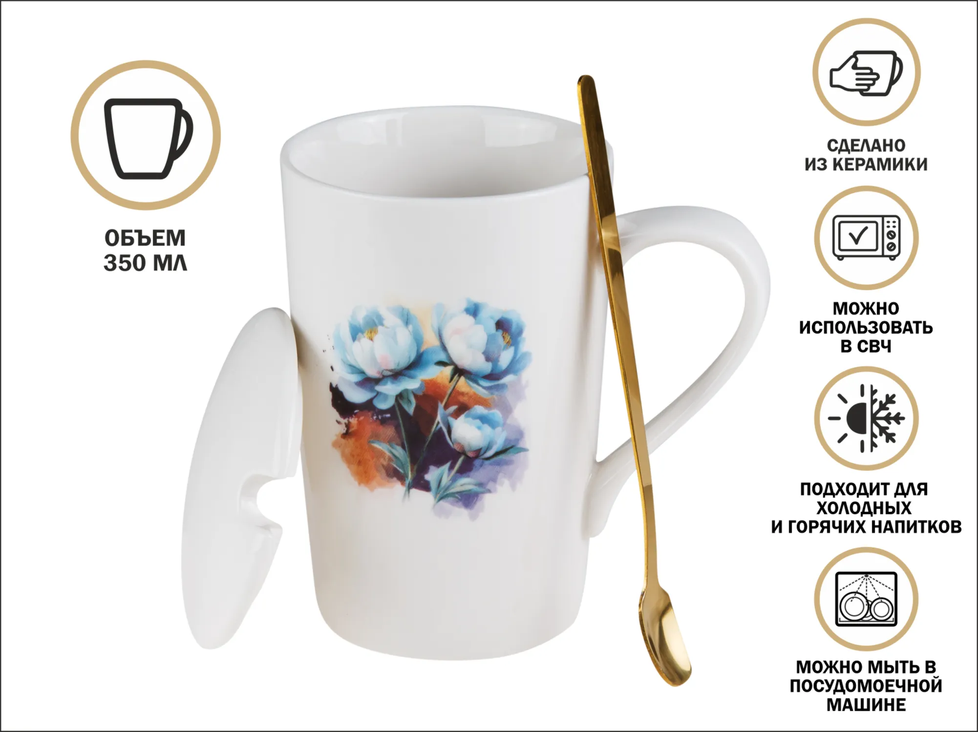 Керамическая кружка станет украшением вашего интерьера, поднимет настроение во время чаепития, семейных и дружеских встреч. Удобная рукоятка позволит крепко держать кружку и не обжигать руки, если напиток будет горячим. В набор входит ложечка из нержавеющей стали золотистого цвета и керамическая крышка. Стильная кружка выручит вас в любой праздник и станет отличным подарком для любимого человека!