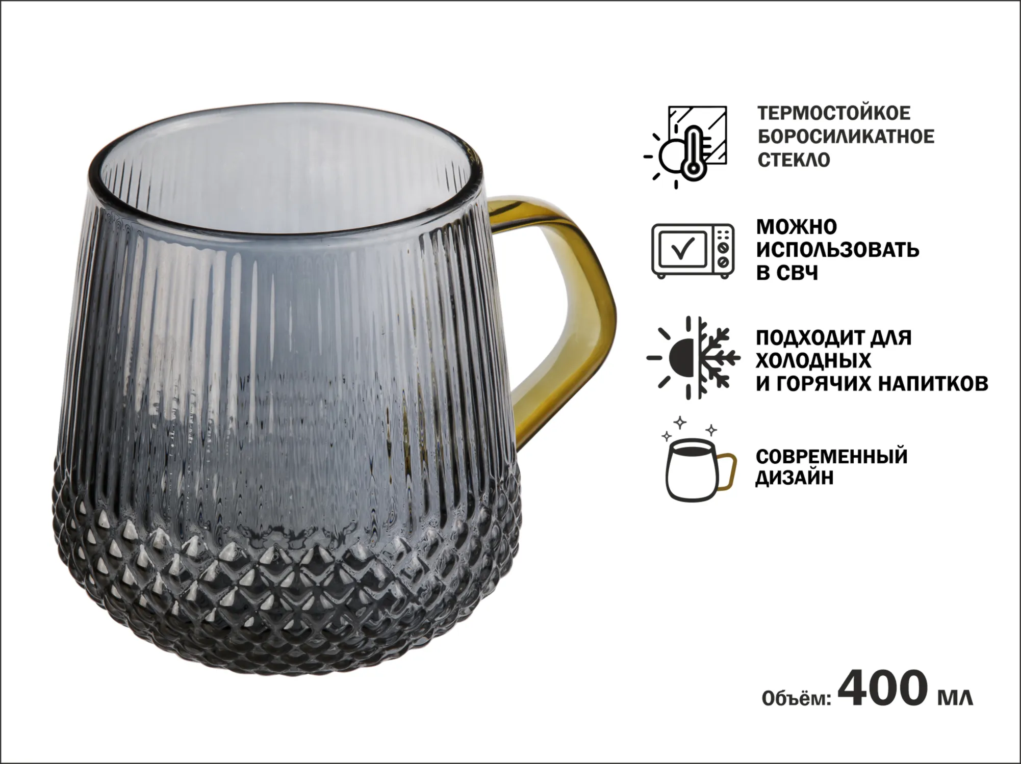 Стеклянная кружка серии SONATA GREY из боросиликатного стекла сочетает в себе утончённость, элегантность и практичность. Фигурные стенки придают кружке лёгкий и современный вид. Идеально подойдёт как для дома, так и для офиса.