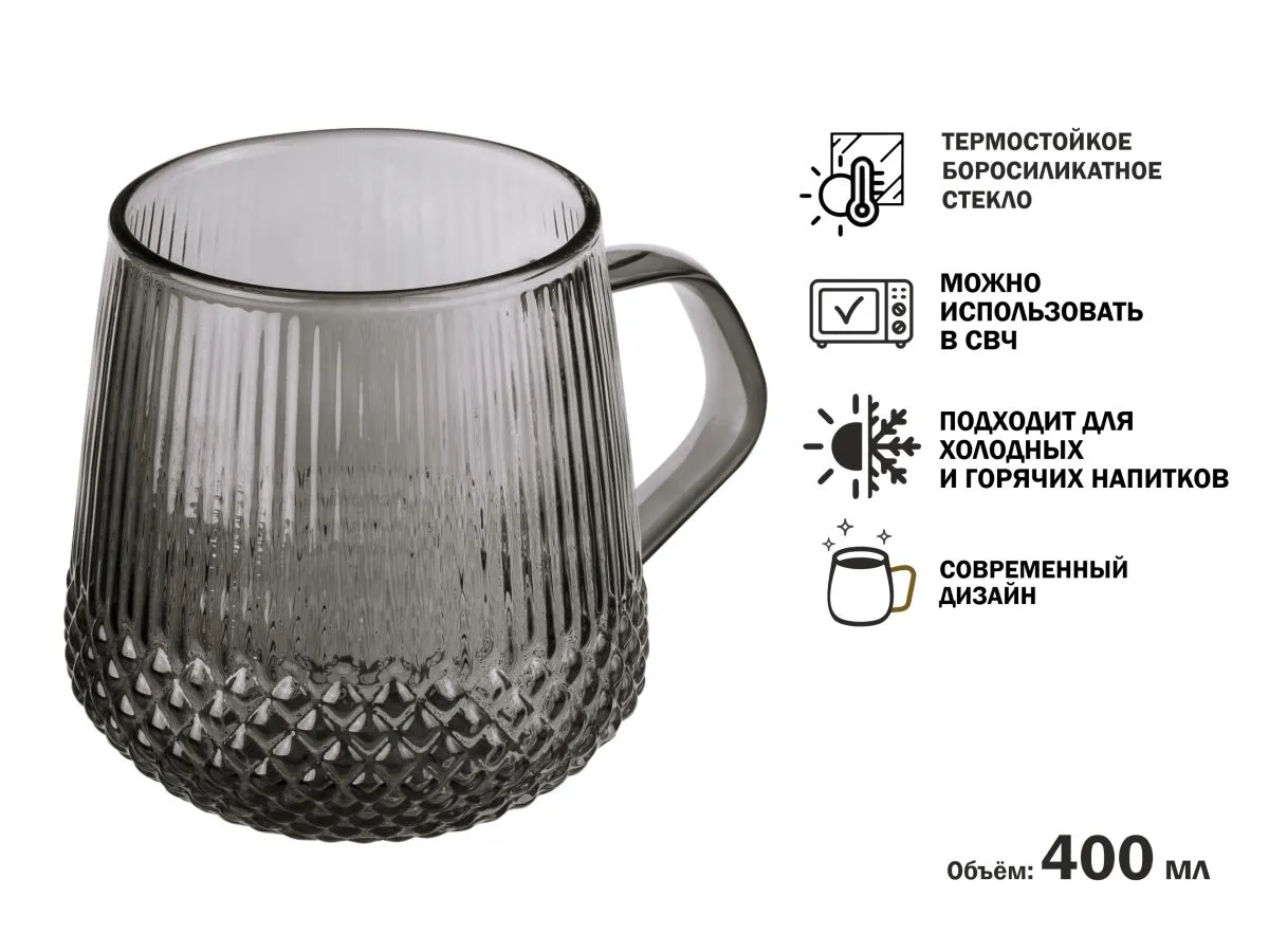 Стеклянная кружка серии SONATA GREY из боросиликатного стекла сочетает в себе утончённость, элегантность и практичность. Фигурные стенки придают кружке лёгкий и современный вид. Идеально подойдёт как для дома, так и для офиса.