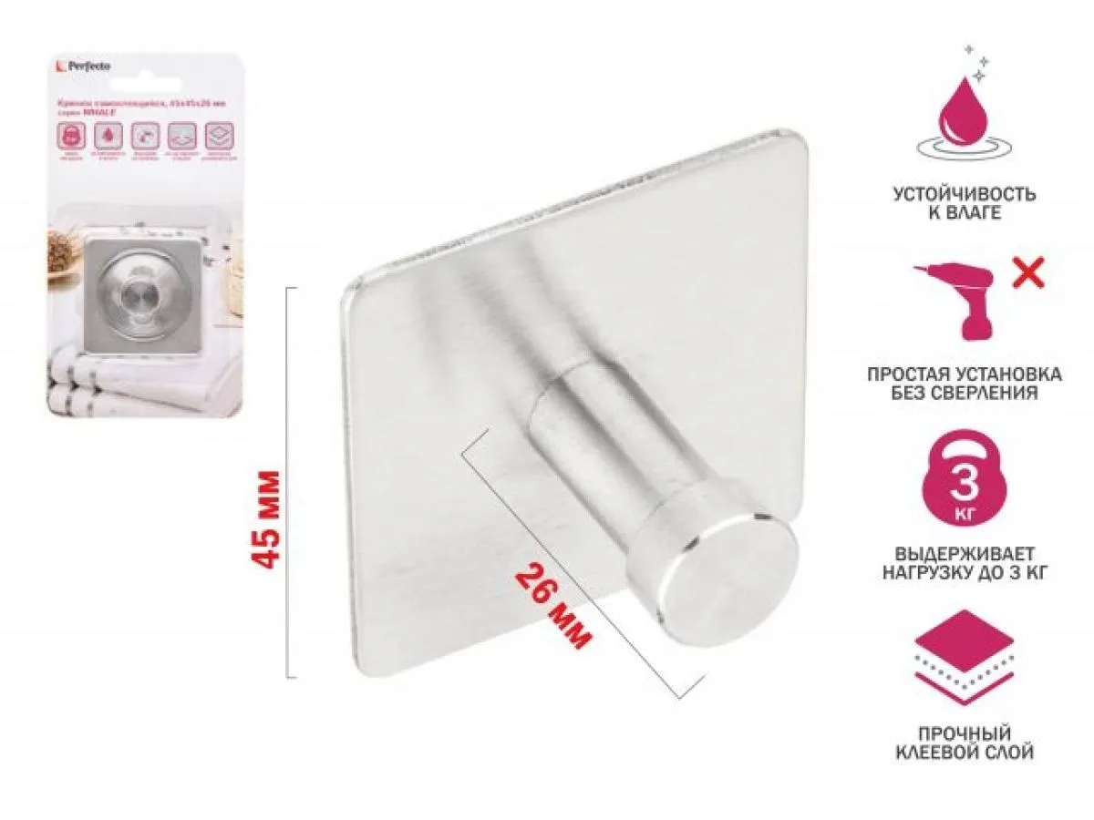 Крючок самоклеящийся WHALE, нержавеющая сталь, блистер, PERFECTO LINEA