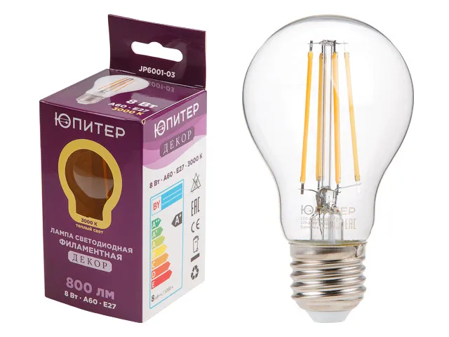 Лампа светодиодная филаментная A60 СТАНДАРТ 8 Вт E27 3000К ЮПИТЕР ДЕКОР