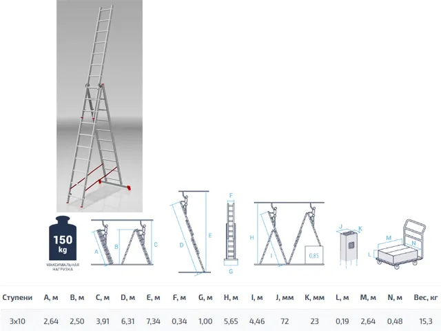 Высота лестницы - 631см, высота стремянки - 250см, высота секции - 264см.