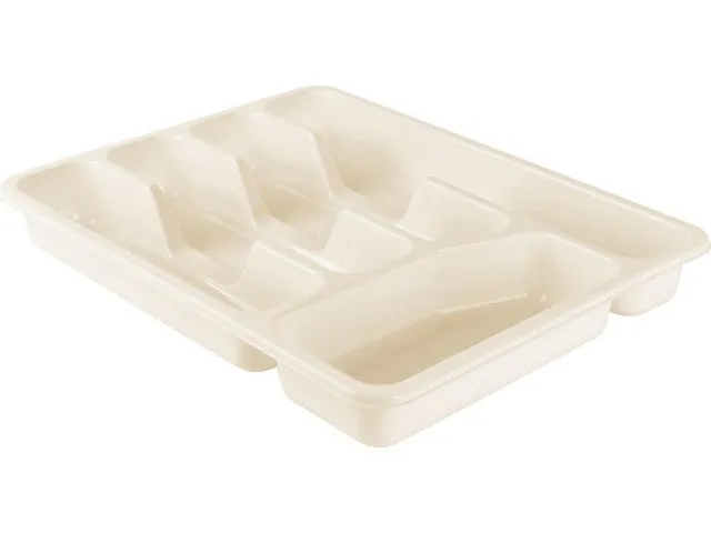Лоток для столовых приборов позволит содержать ящики кухонного стола в полном порядке. Оптимально организуйте пространство с помощью пяти отсеков, разложив вилки, ложки, ножи и прочие столовые принадлежности по-отдельности. Большой отсек подойдет для хранения рулона с пакетами для завтраков. Легкий, прочный, пищевой пластик прослужит долгие годы и будет безопасен для здоровья. Материал не боится воды, лоток можно мыть в посудомоечной машине, поэтому уход за ним не составит труда.