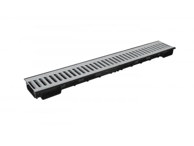 Канал пластиковый системы Lite из вторичного ПЭ-ПП. Имеет сформированное отверстие для подключения труб 110 мм для выпуска через дно лотка, специальный паз для подключения других лотков под углом 90 и специальный паз для распила лотка. Оцинкованная решетка с безболтовым креплением. Класс нагрузки А 15.