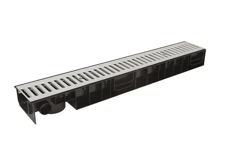 Канал пластиковый системы STANDART из вторичного ПЭ-ПП. Сформированное отверстие для подключения труб O 50 мм., O 110 для выпуска через дно лотка. Специальный паз для подключения других лотков под углом 90 и специальным пазом для распила лотка. Оцинкованная стальная решетка. Крепление: стальная оцинкованная планка с болтом. Класс нагрузки А 15.