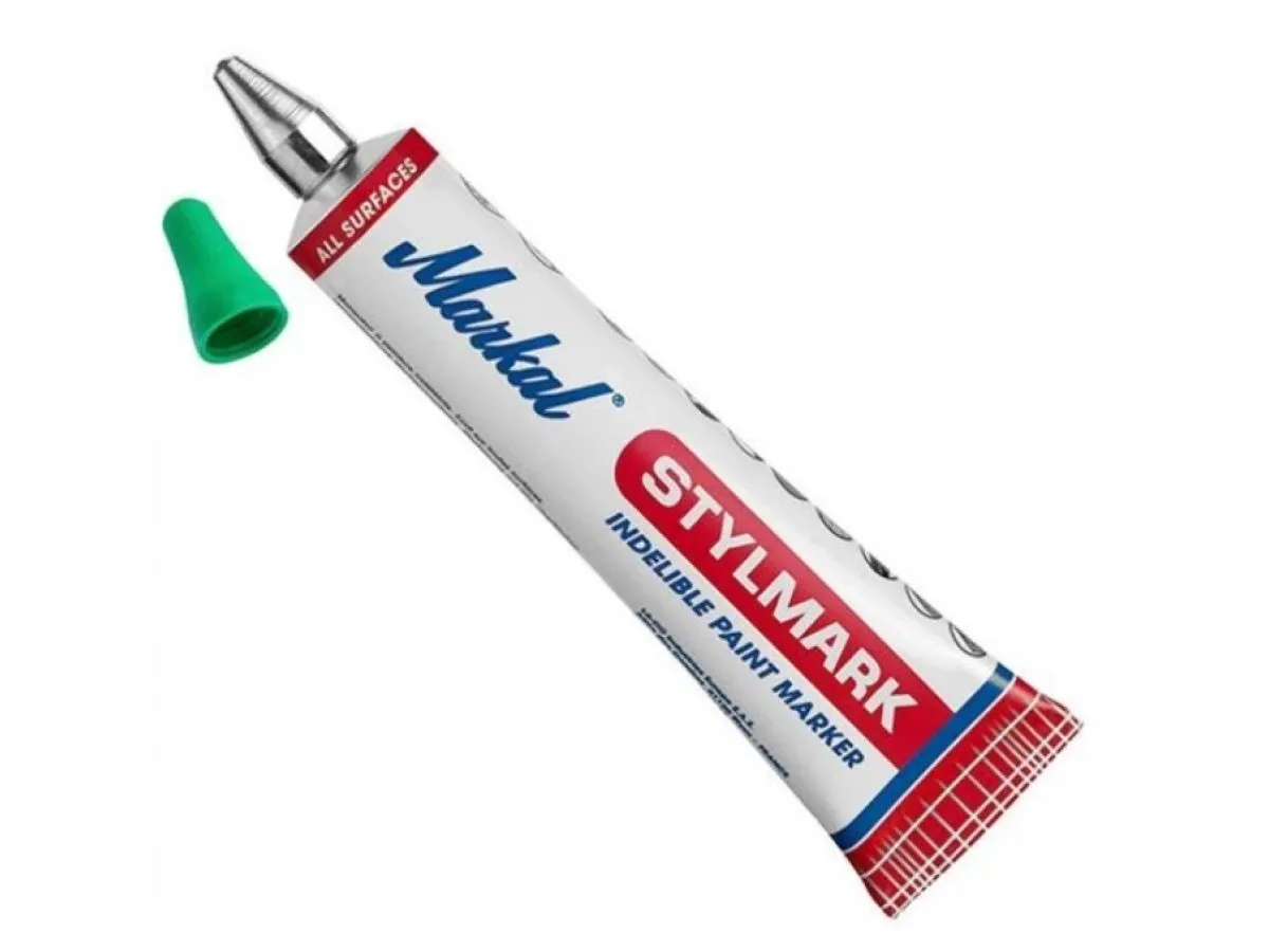 Markal Stylmark - маркер с металлическим шариковым наконечником предназначен для большинства поверхностей. Металлическая туба и густая краска обеспечивают маркировку на шероховатых вертикальных и потолочных поверхностях, а также обеспечивают сцепление краски с жирными и мокрыми поверхностями. Уникальная краска маркера устойчива к механическим воздействиям и воздействию растворителей, кислот, бензина, масла и других агрессивных веществ. Отличное решение для инвентаризации.