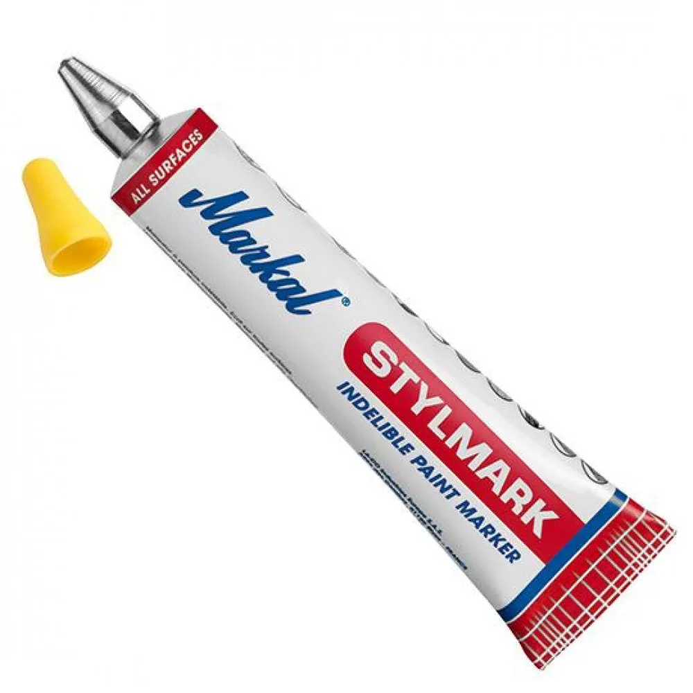 Markal Stylmark - маркер с металлическим шариковым наконечником предназначен для большинства поверхностей. Металлическая туба и густая краска обеспечивают маркировку на шероховатых вертикальных и потолочных поверхностях, а также обеспечивают сцепление краски с жирными и мокрыми поверхностями. Уникальная краска маркера устойчива к механическим воздействиям и воздействию растворителей, кислот, бензина, масла и других агрессивных веществ. Отличное решение для инвентаризации.