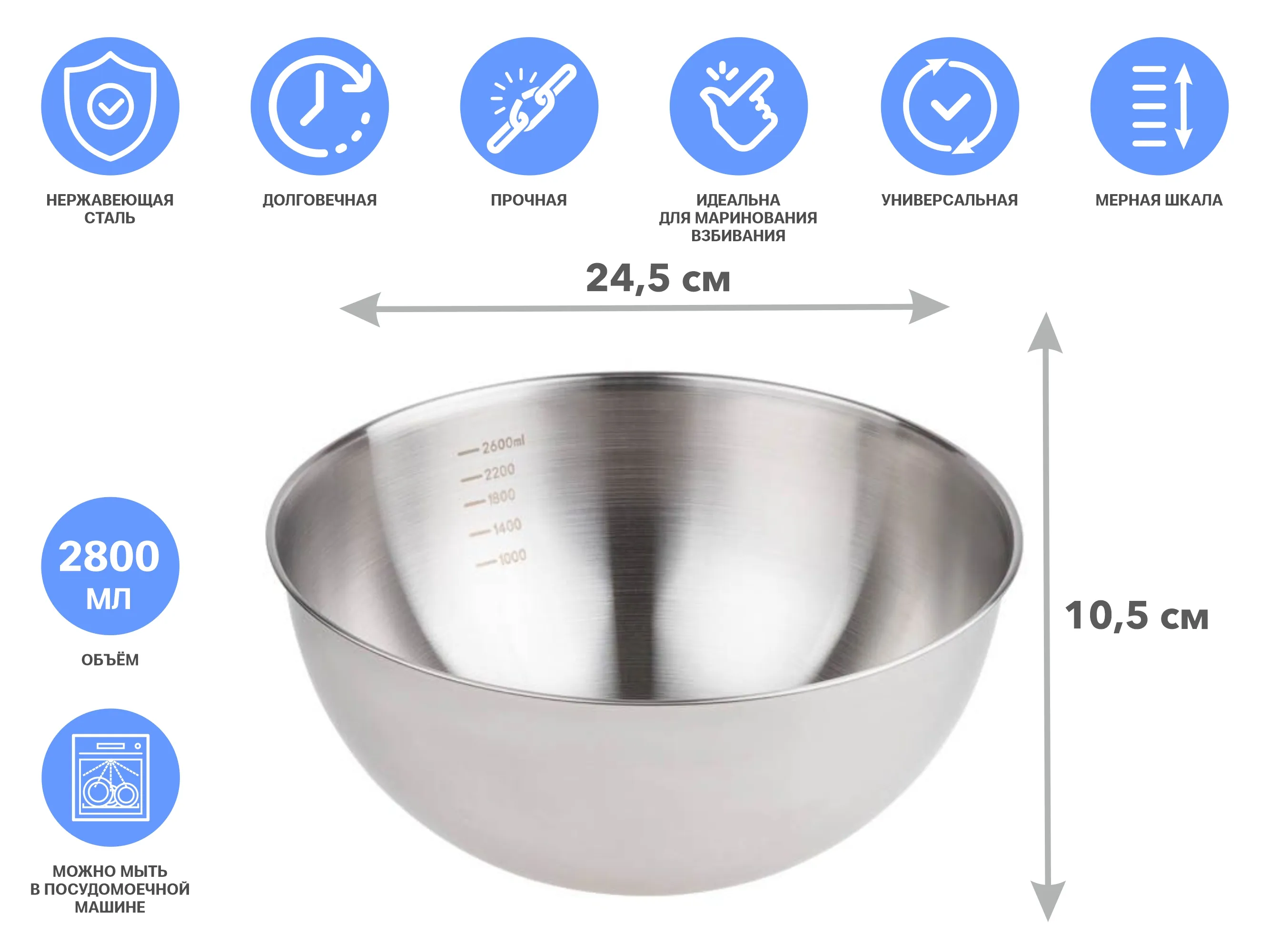 Миска для взбивания из нерж. стали, диаметр 24.5 см, с мерной шкалой, серия CHEF, PERFECTO LINEA