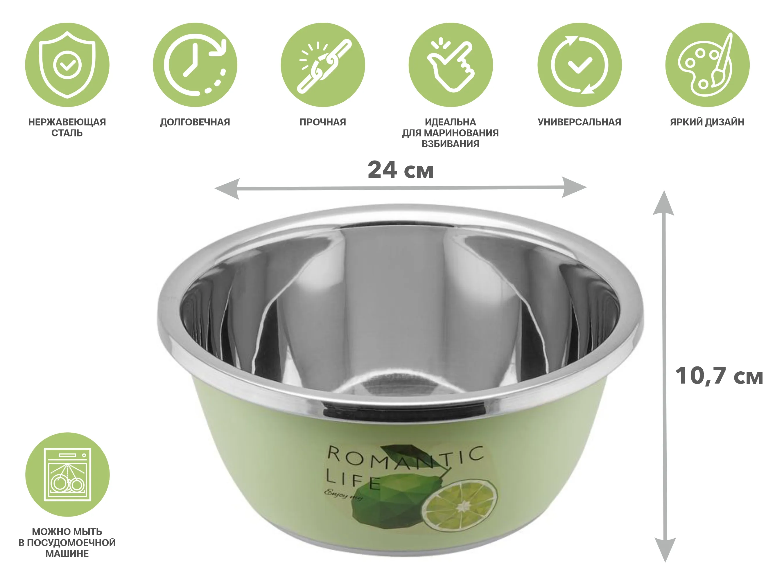 Миска для взбивания из нержавеющей стали, диаметр 24 см, лайм, серия Romantic life, PERFECTO LINEA
