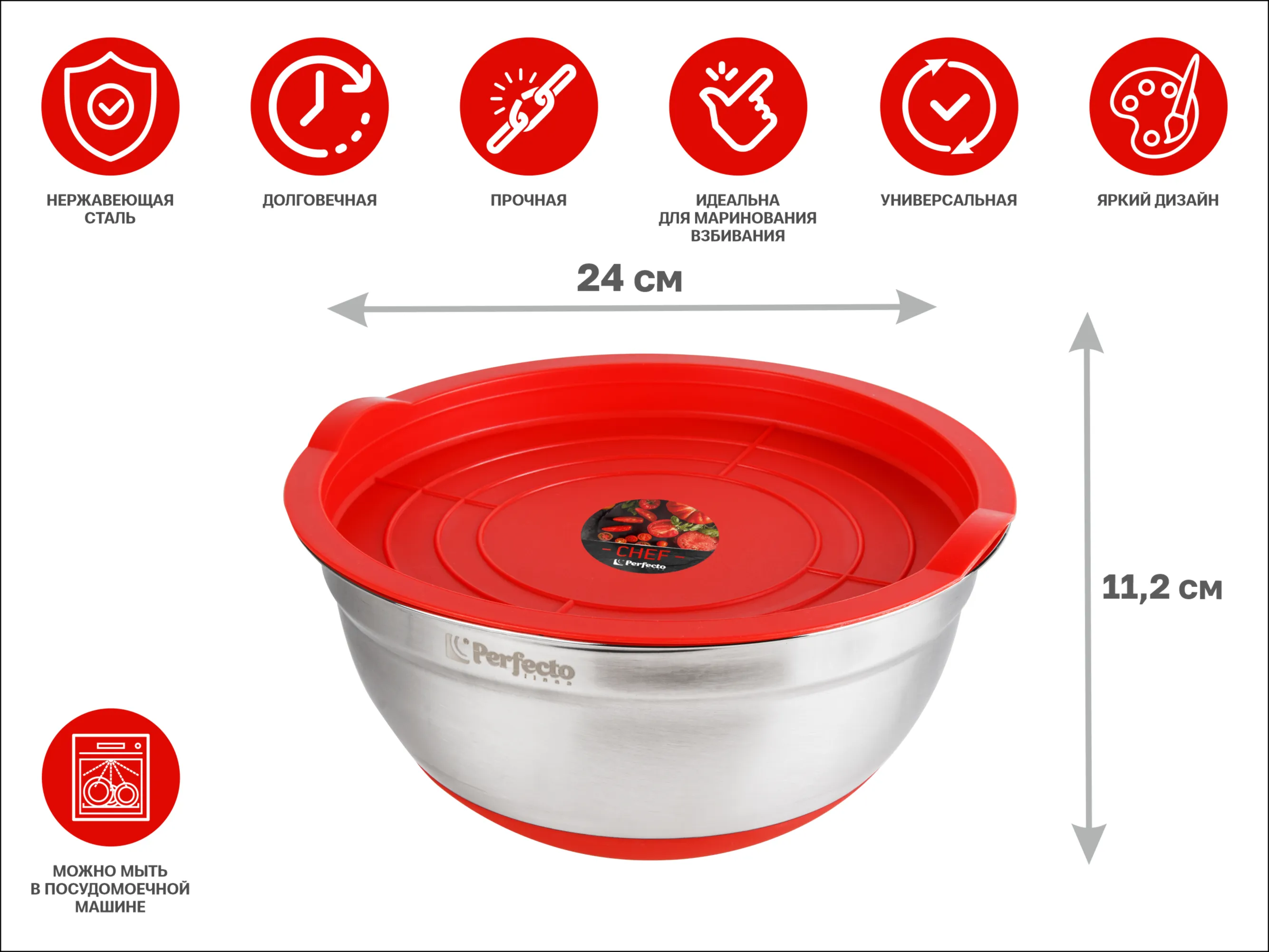 Миска для взбивания из нержавеющей стали, диаметр 24 см, с крышкой, серия CHEF, PERFECTO LINEA