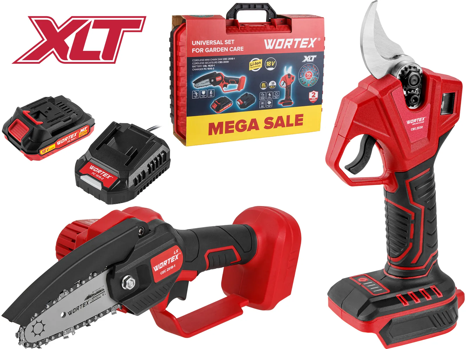 Аккум. мини-пила WORTEX LX CEC 2518-1 + Аккум. секатор WORTEX CBS 2030 + 1 АКБ 2А*ч + ЗУ 2 А