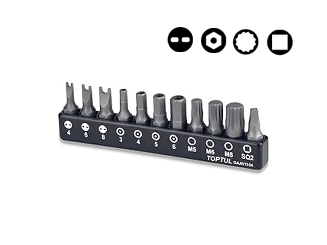 Набор бит 14 11 штук TOPTUL (GAAV1104) содержит биты: под вилочный ключ 4, 6, 8 мм, RIBE CS 3, 4, 5, 6 мм, XZN M5, M6, M8, внутренний четырехгранник SQ2.