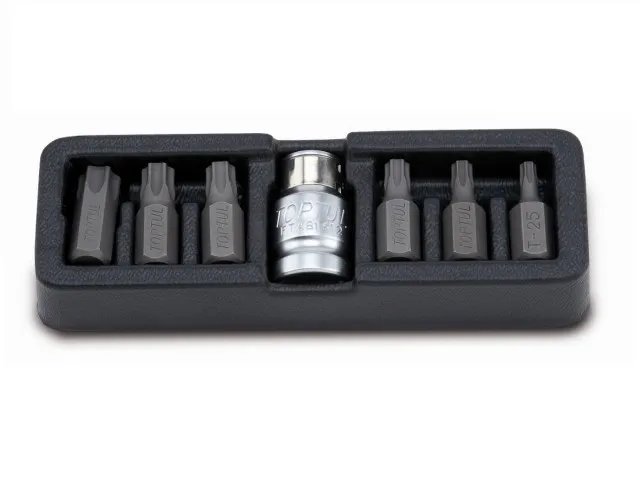 Набор бит Toptul Torx 1/2" из 7 предметов, содержащий ассортимент бит для выполнения наиболее распространенных операций заворачивания и отворачивания.