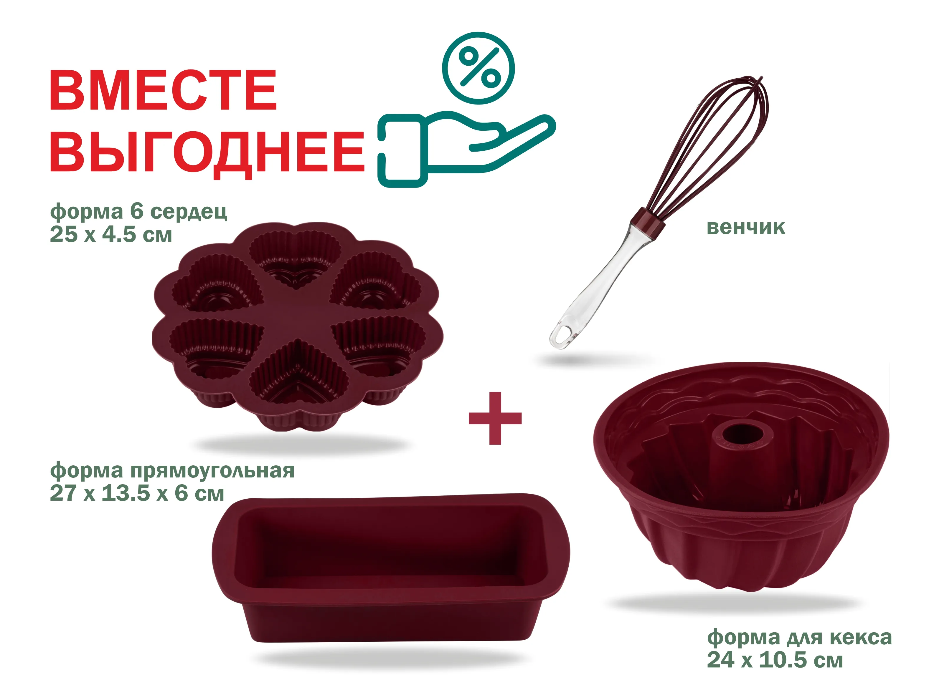 Размер форм для выпечки: 24 х 10.5 см, 25 х 4,5 см, 27 х 13,5 х 6 см.