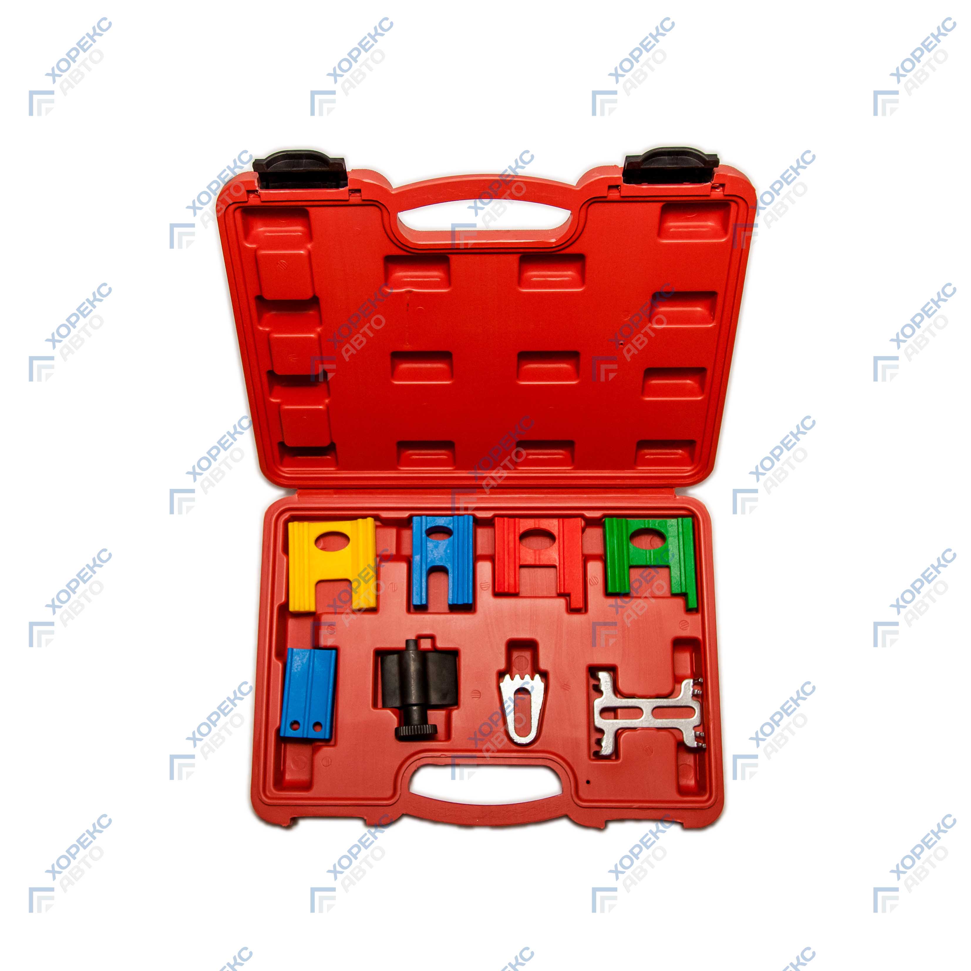 Набор оснащен инструментами для фиксации распредвала во время замены или установки зубчатого ремня.