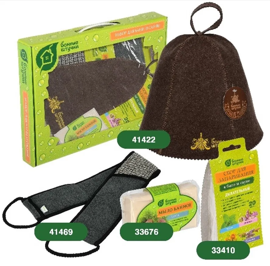 Комплектация: шапка для бани, мочалка, сбор травяной, мыло.